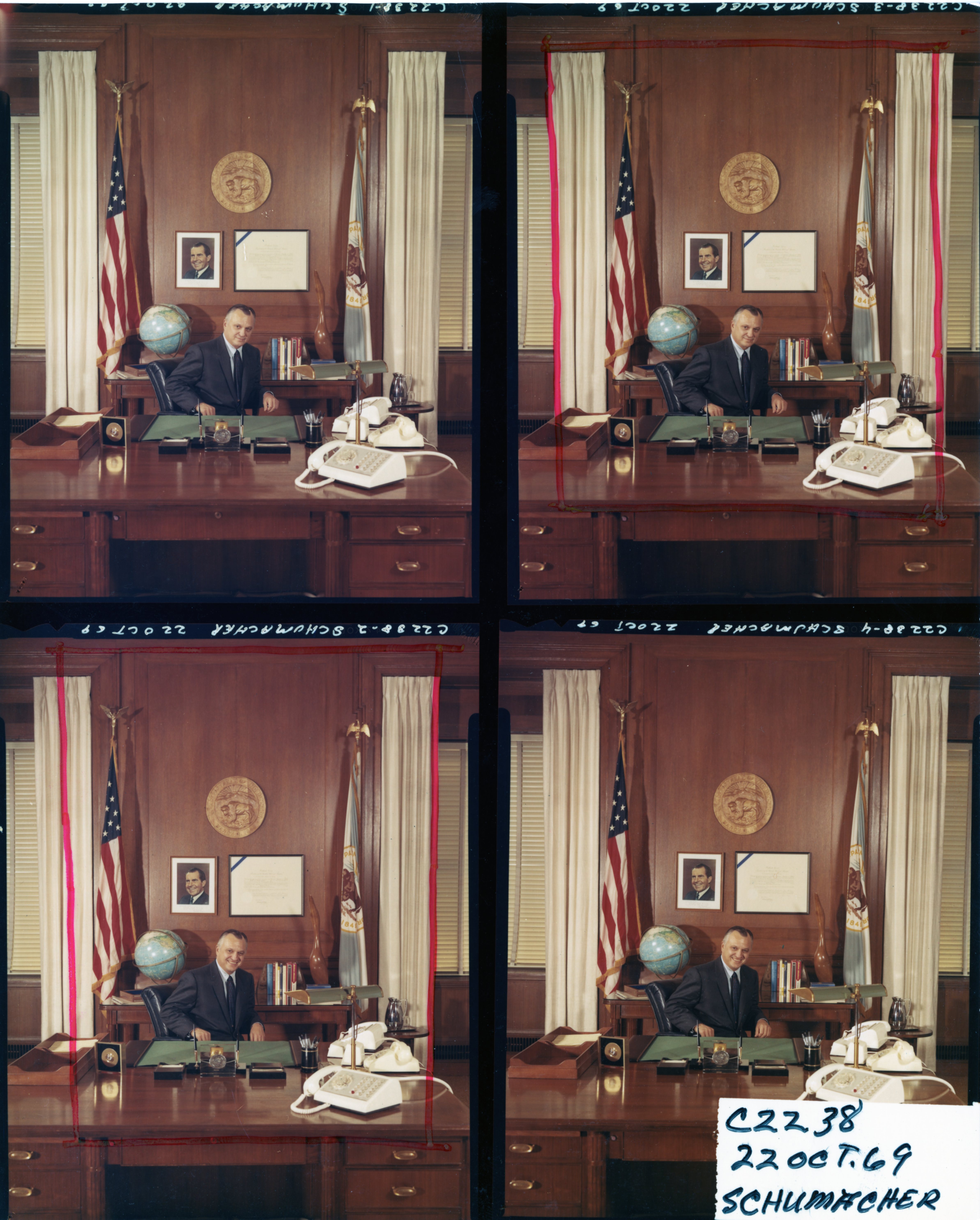• Frame(s): WHPO-2238-01-04 No negatives - contact sheet only., Walter Hickel sitting at his desk. 10/22/1969, Washington, D.C. Walter Hickel's office. Walter Hickel.
