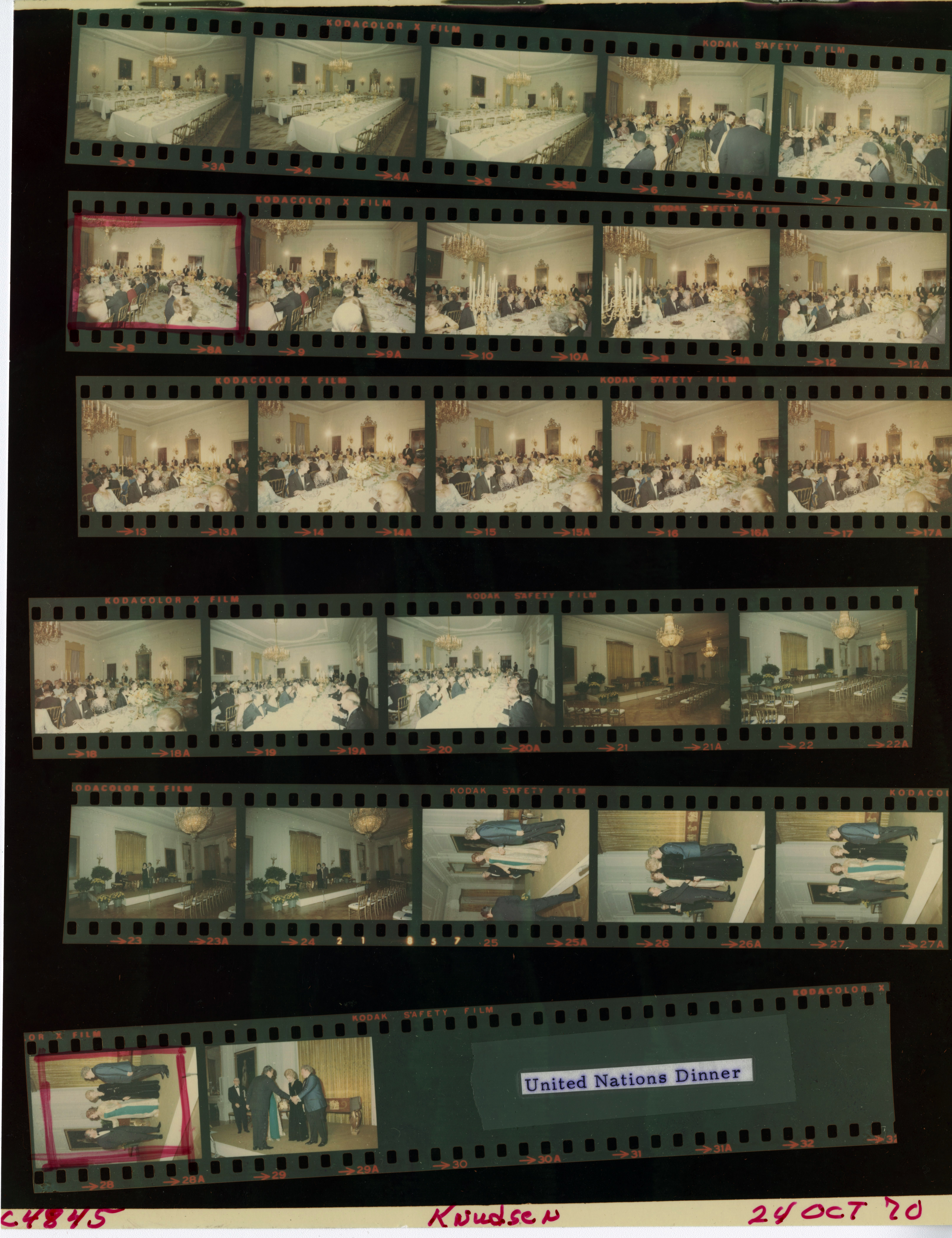- Frame(s): WHPO-4845-06-20, U.N. delegates from many nations seated, talking and dining at a White House state dinner honoring the 25th Anniversary of the United Nations. Butlers stand behind diners at the head table. 10/24/1970, Washington, D.C. White House, State Dining Room. President Nixon, delegate Olof Palme standing, unidentified delegates.