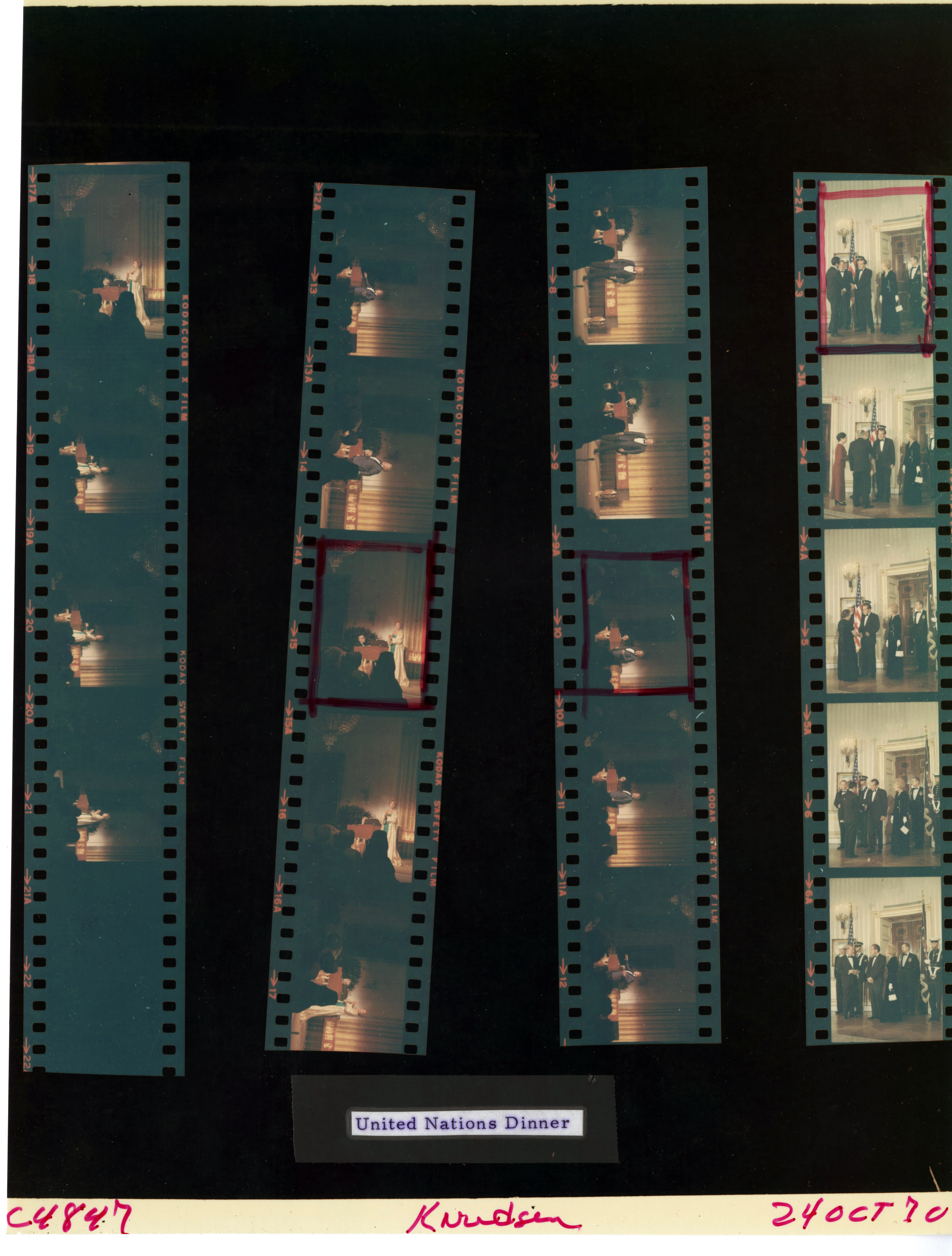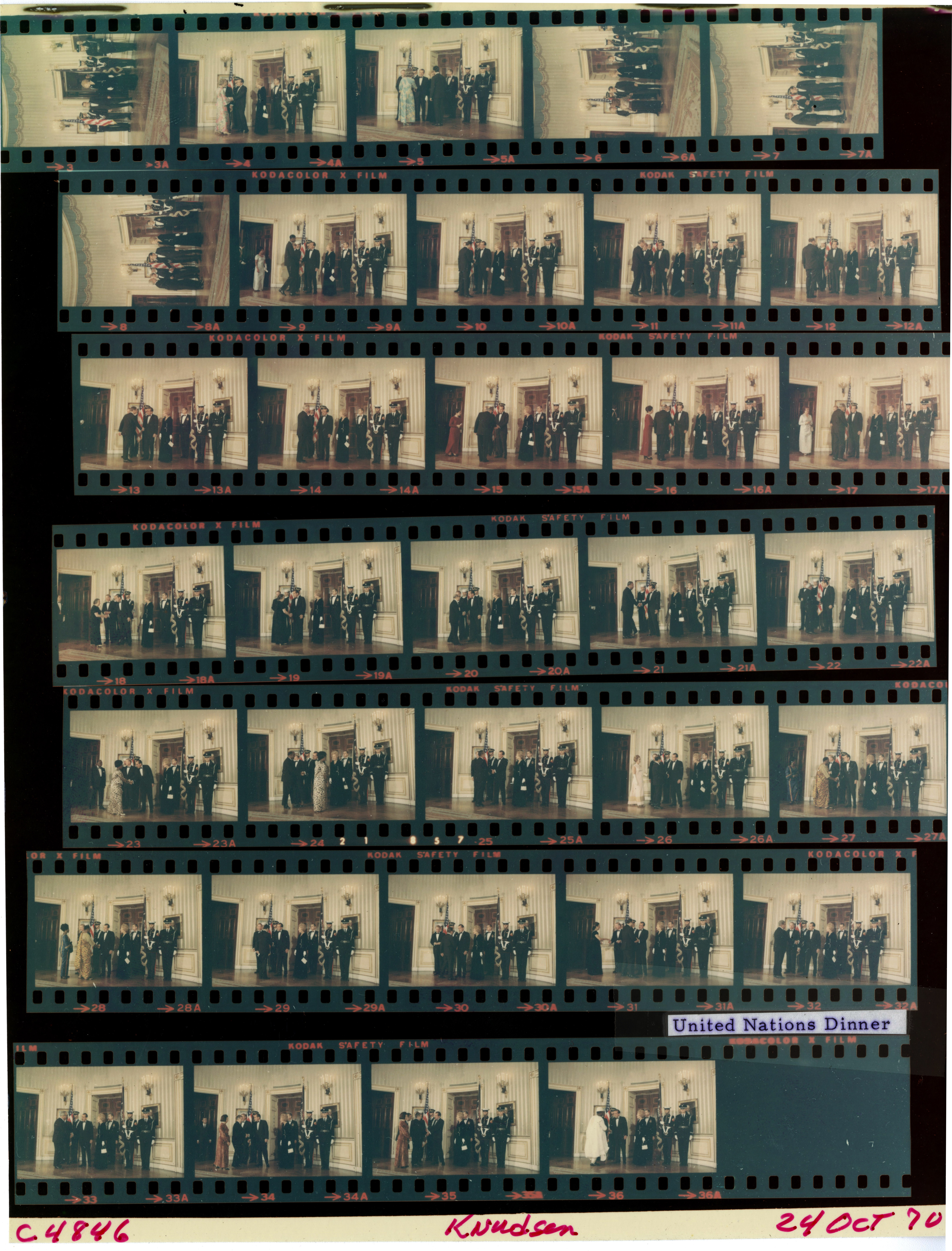 - Frame(s): WHPO-4846-02-36, President Nixon and Pat Nixon greet individual United Nations Delegates at a reception receiving line before a White House state dinner celebrating the 25th Anniversary of the U.N. 10/24/1970, Washington, D.C. White House, Reception room entrance. President Nixon, unidentified U.N. Delegates, Gold Meir.