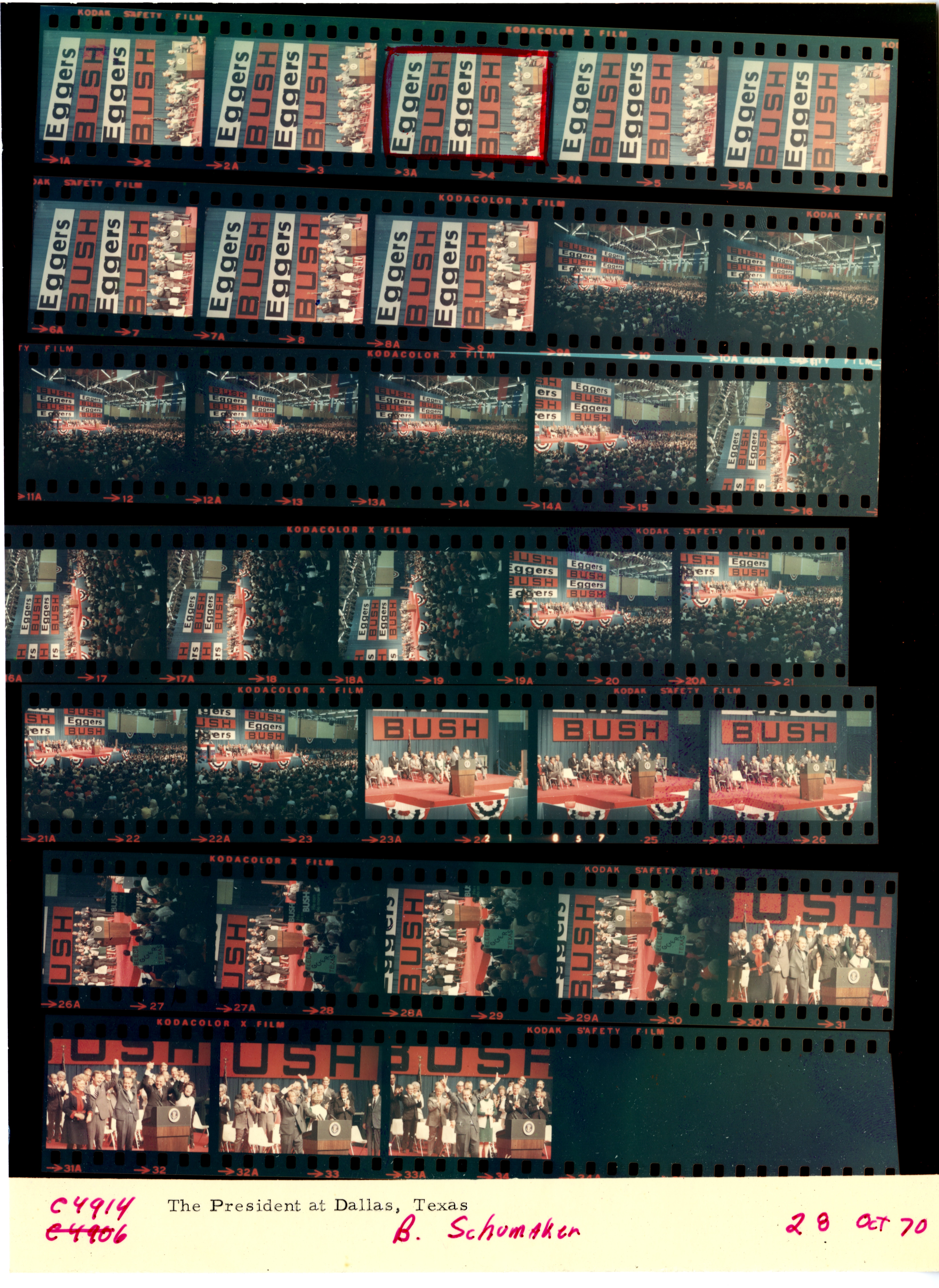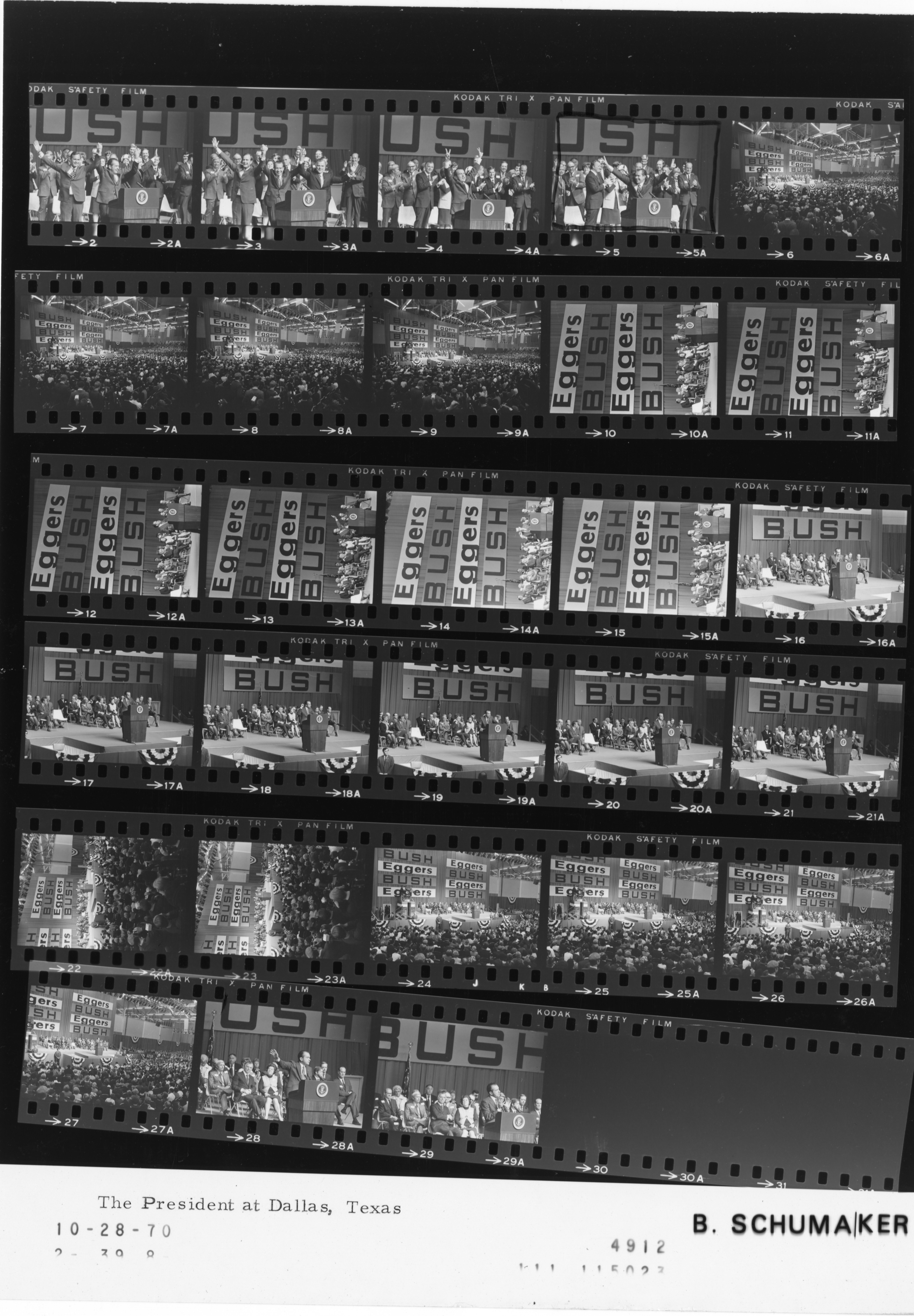 - Frame(s): WHPO-4913-, President Nixon speaking at a political rally for Congressman George H. W. Bush and Gubernatorial candidate Paul Eggers. 10/28/1970, Dallas, Texas Market Hall, Industrial Mart. President Nixon, Congressman George Bush, Gubernatorial candidate Paul Eggers, platform guests.