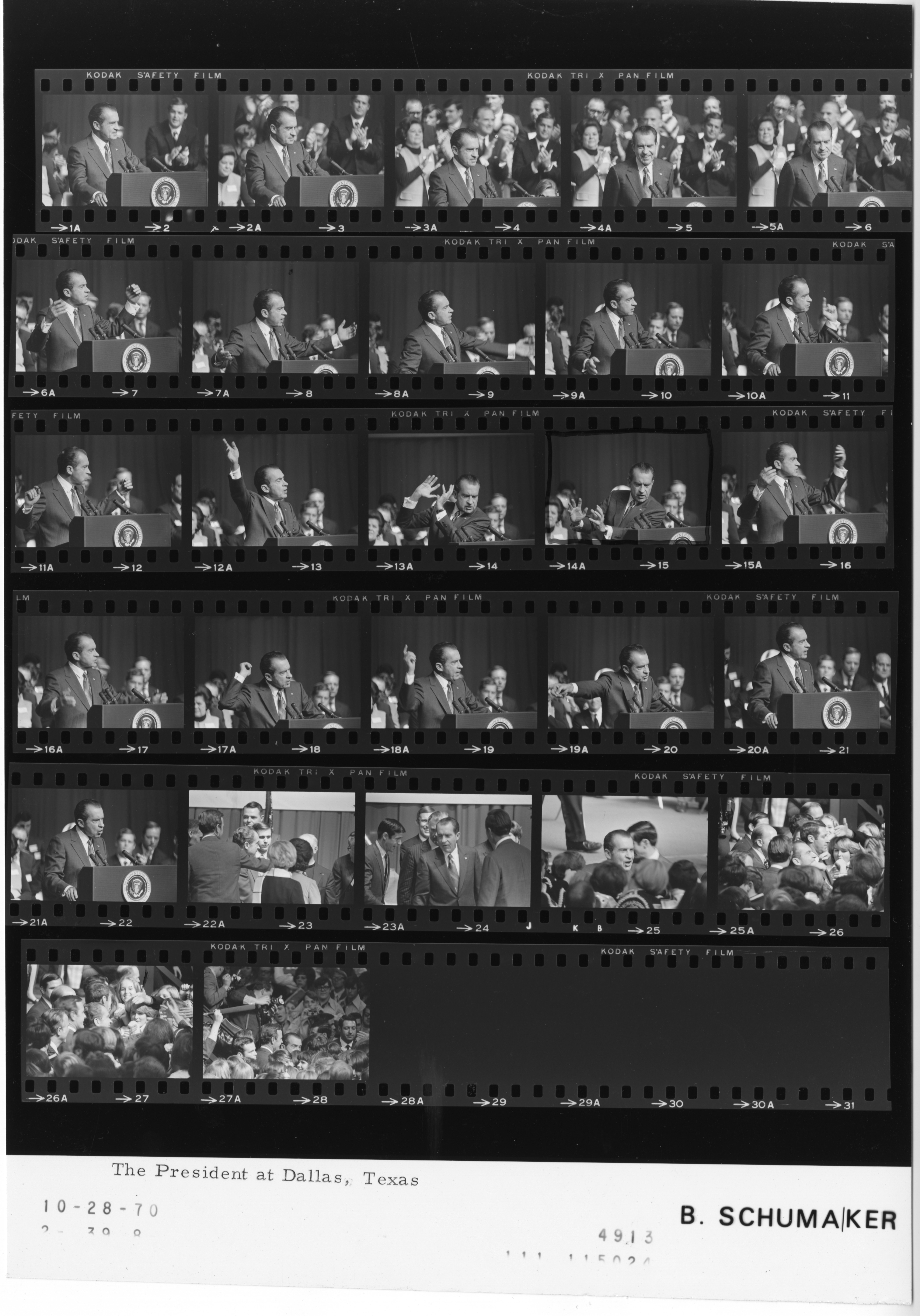- Frame(s): WHPO-4913-14, President Nixon making a defensive hand gesture while speaking at a political rally for Congressman George H. W. Bush and Gubernatorial candidate Paul Eggers. 10/28/1970, Dallas, Texas Market Hall, Industrial Mart. President Nixon, platform guests, unidentified persons.