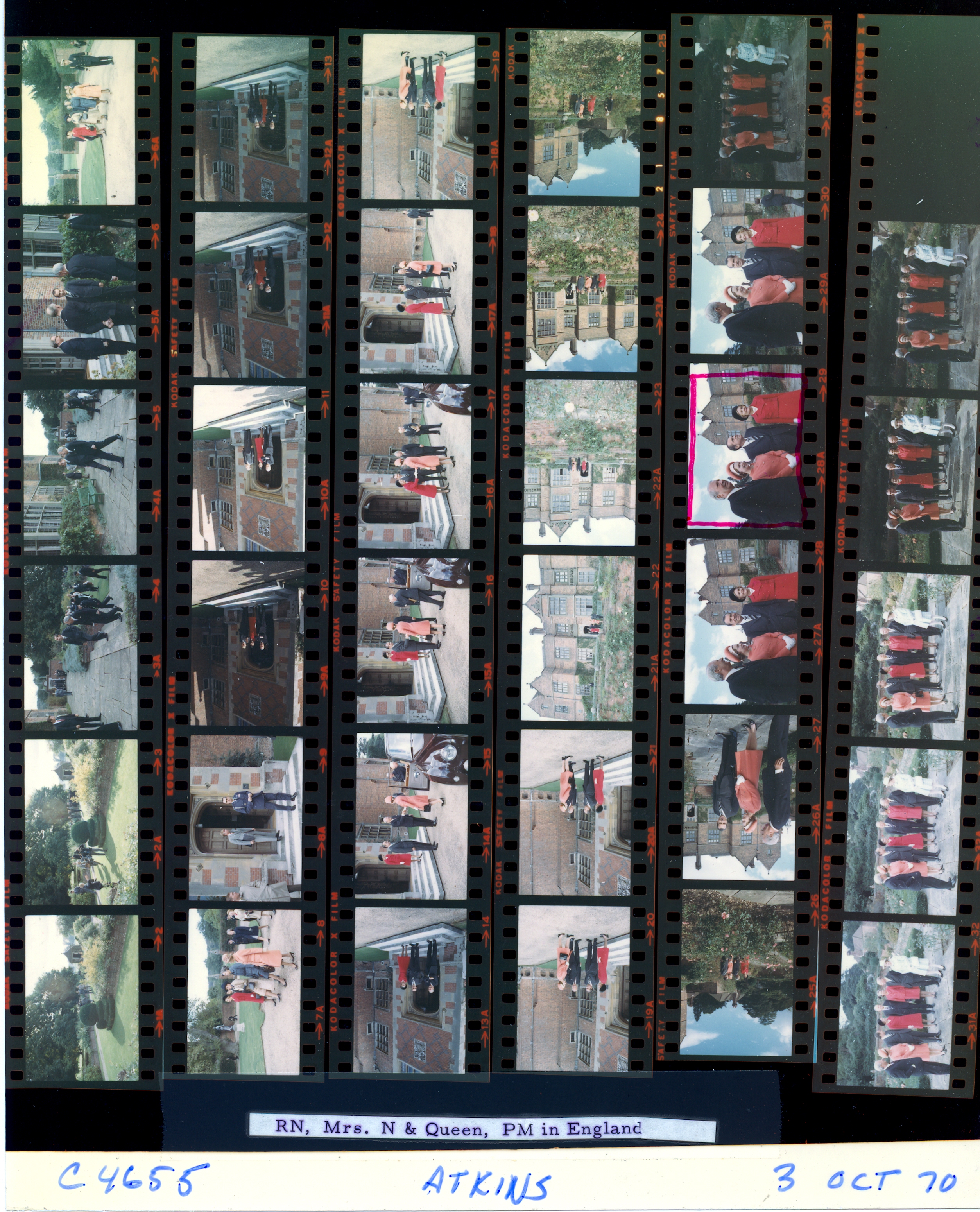 - Frame(s): WHPO-4654-23A, Pat Nixon, Queen Elizabeth II walking out a doorway together, followed by President Nixon and British Prime Minister Heath. 10/3/1970, Buckinghamshire, England Chequers, Rose Garden. President Nixon, Pat Nixon, Queen Elizabeth II, Edward Heath.