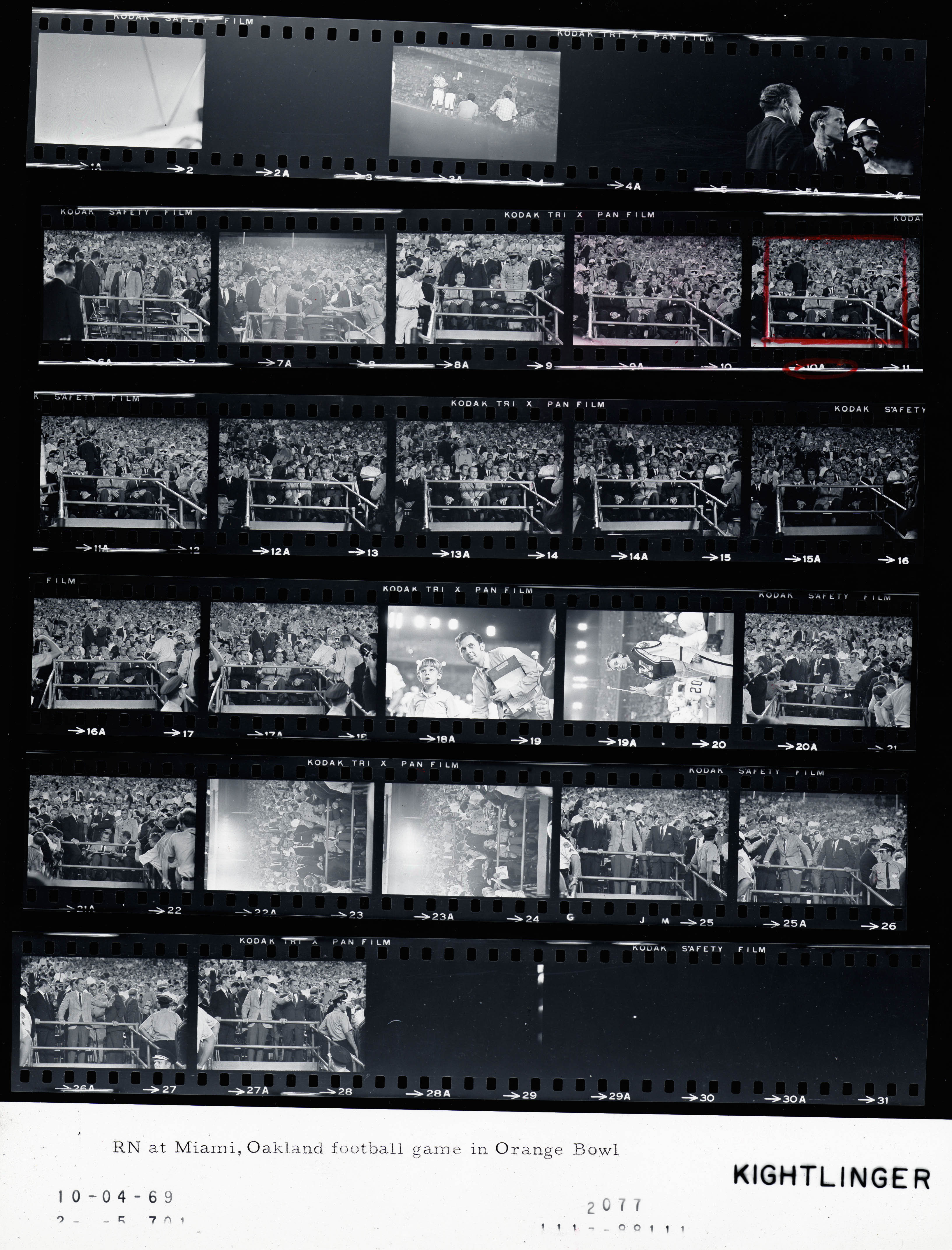 - Frame(s): WHPO-2077-06A-27A, President Nixon in the stands during the Miami Dolphins VS Oakland Raiders football game. 10/4/1969, Miami, Florida Orange Bowl. President Nixon, Charles Bebe Rebozo, aides, fans.