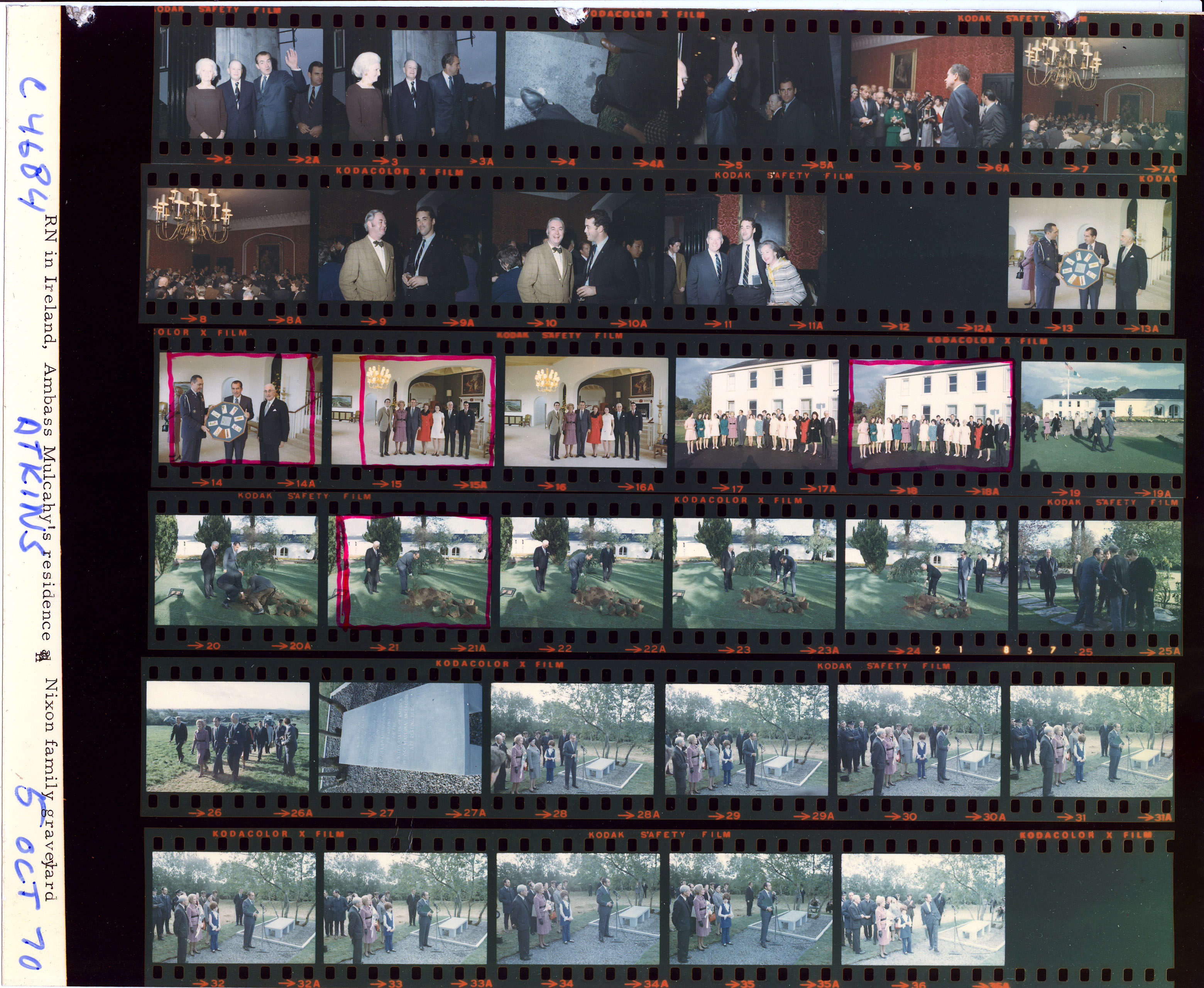 - Frame(s): WHPO-4684-25, President Nixon greeting staff landscape gardeners after planting a tree at the residence (possibly) of Ambassador John D.J. Moore while the Ambassador stands nearby. 10/5/1970, Limerick, Ireland Kilfrush House. President Nixon, John A. Mulcahy, unidentified aides or gardeners.