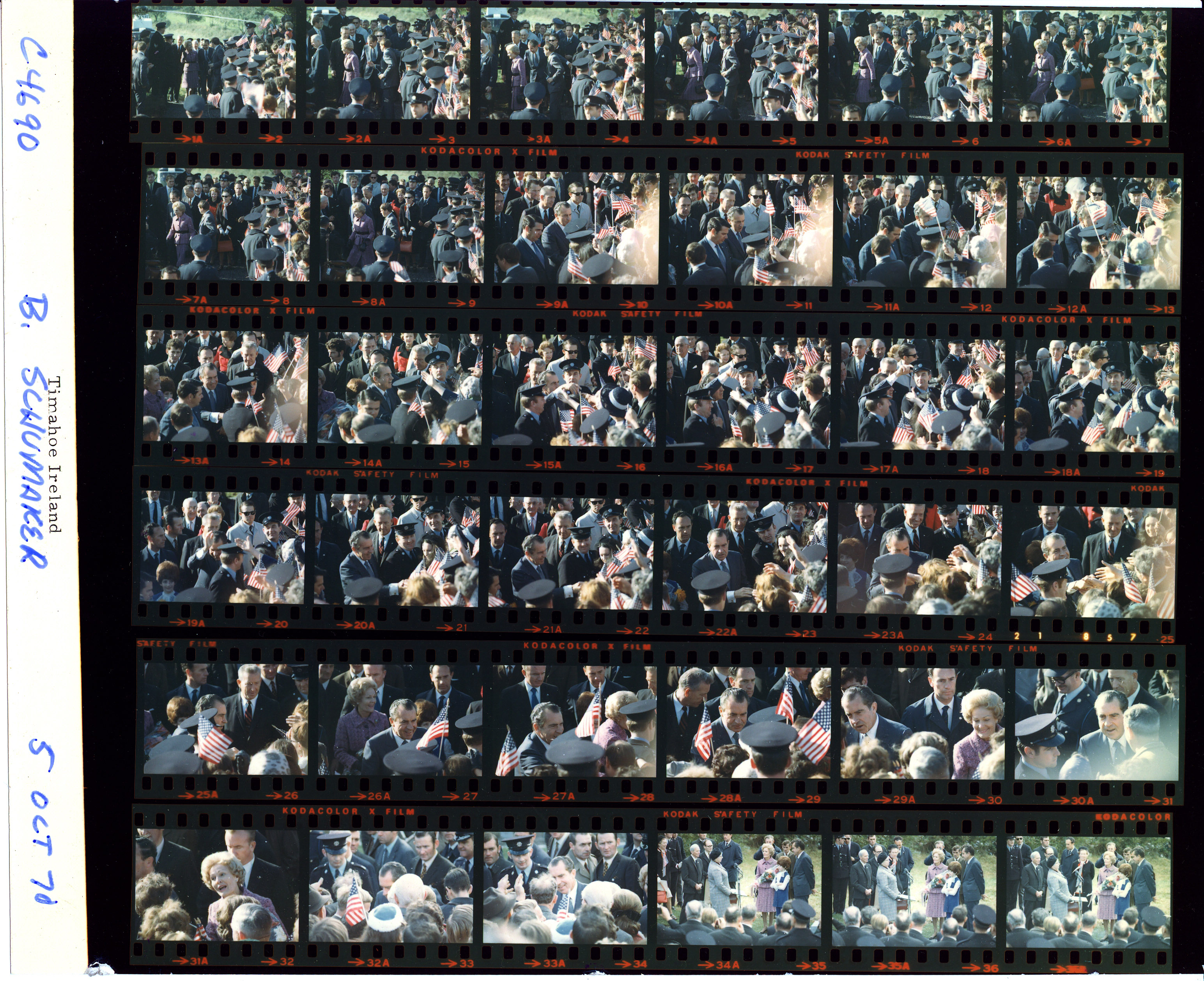 - Frame(s): WHPO-4682-06-07, President Nixon greeting a representative of the community and receives a scroll document from him at the Quaker cemetery in Timahoe, Ireland. 10/5/1970, Timahoe, Ireland Quaker Cemetery. President Nixon, unidentified elderly man.