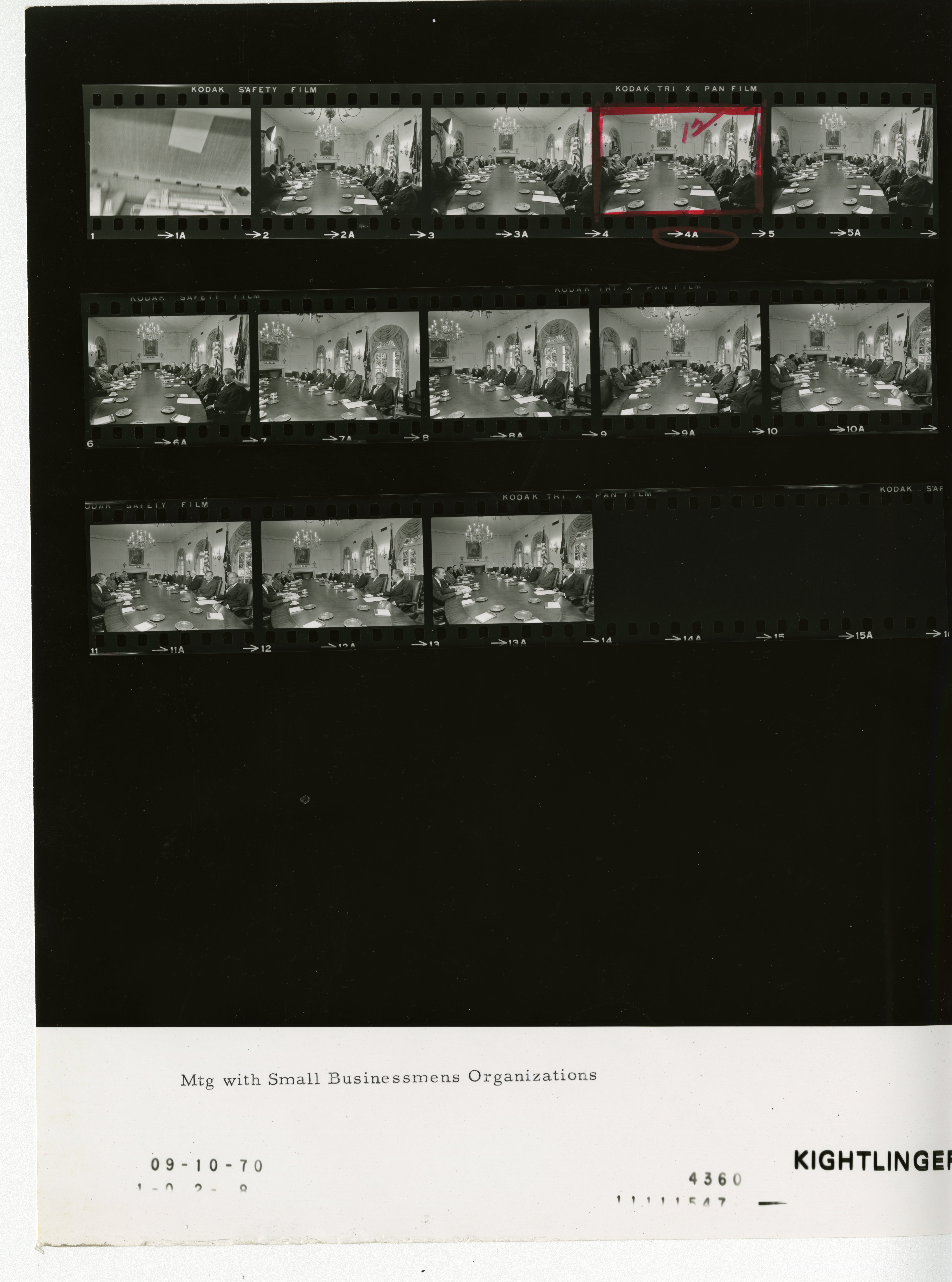 - Frame(s): WHPO-4360-02A-13A, President Nixon meeting with officers of National Small Business Association. 9/10/1970, Washington, D.C. White House Cabinet Room. President Nixon, Thomas M. Crosby, Walter B. Stalts, Wilson S. Johnson, Paul Costello, Rufus Gosnell, John Lewis, Richard G. Lee, Lewis A. Shattuck, Berkely G. Burrell, Charles W. Colson, George T. Bell.
