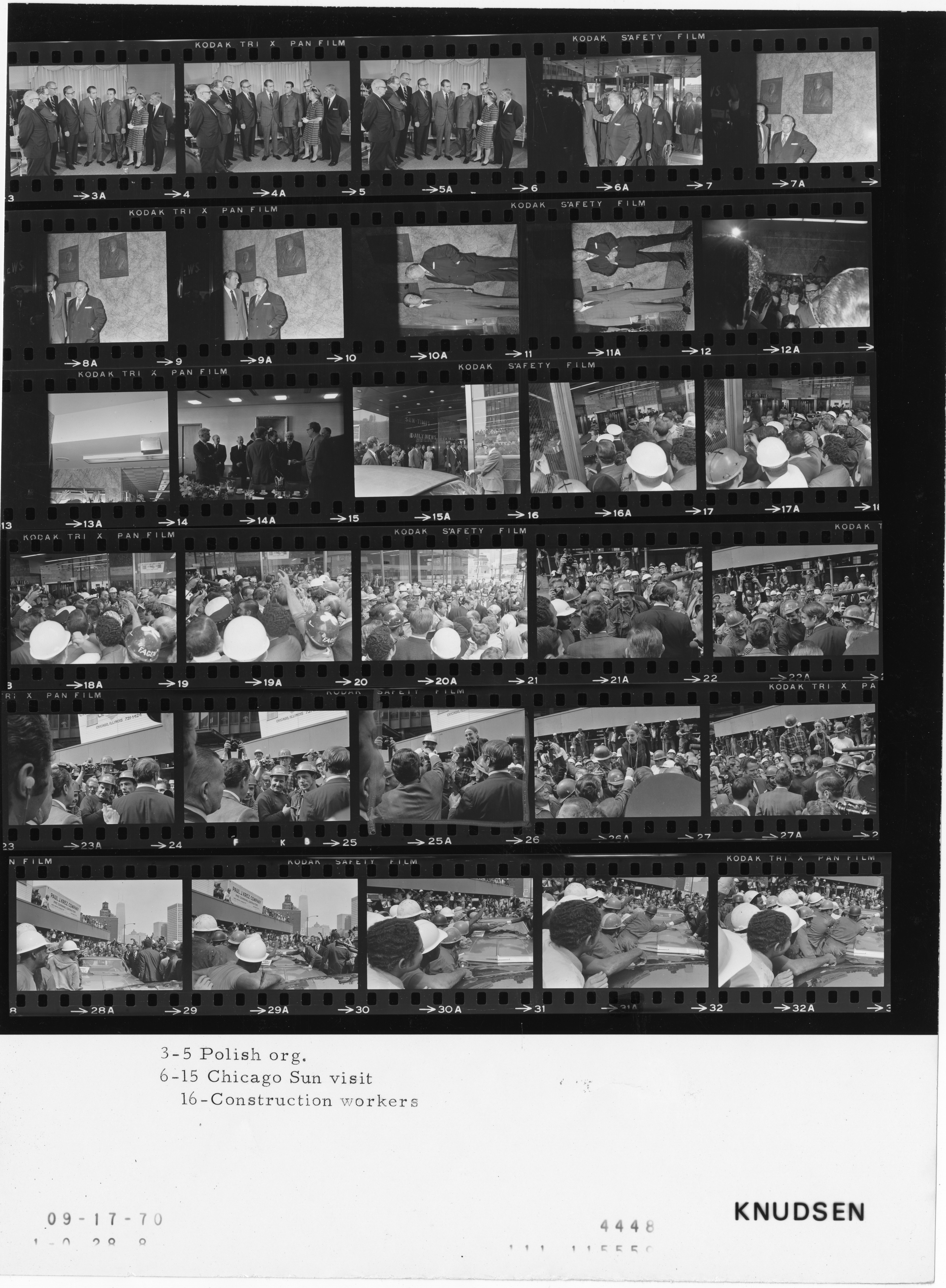 - Frame(s): WHPO-4448-16A-32A, President Nixon greeting crowd of Chicago construction workers. 9/17/1970, Chicago, IL Sun Times building, entrance. President Nixon, Chicago construction workers.