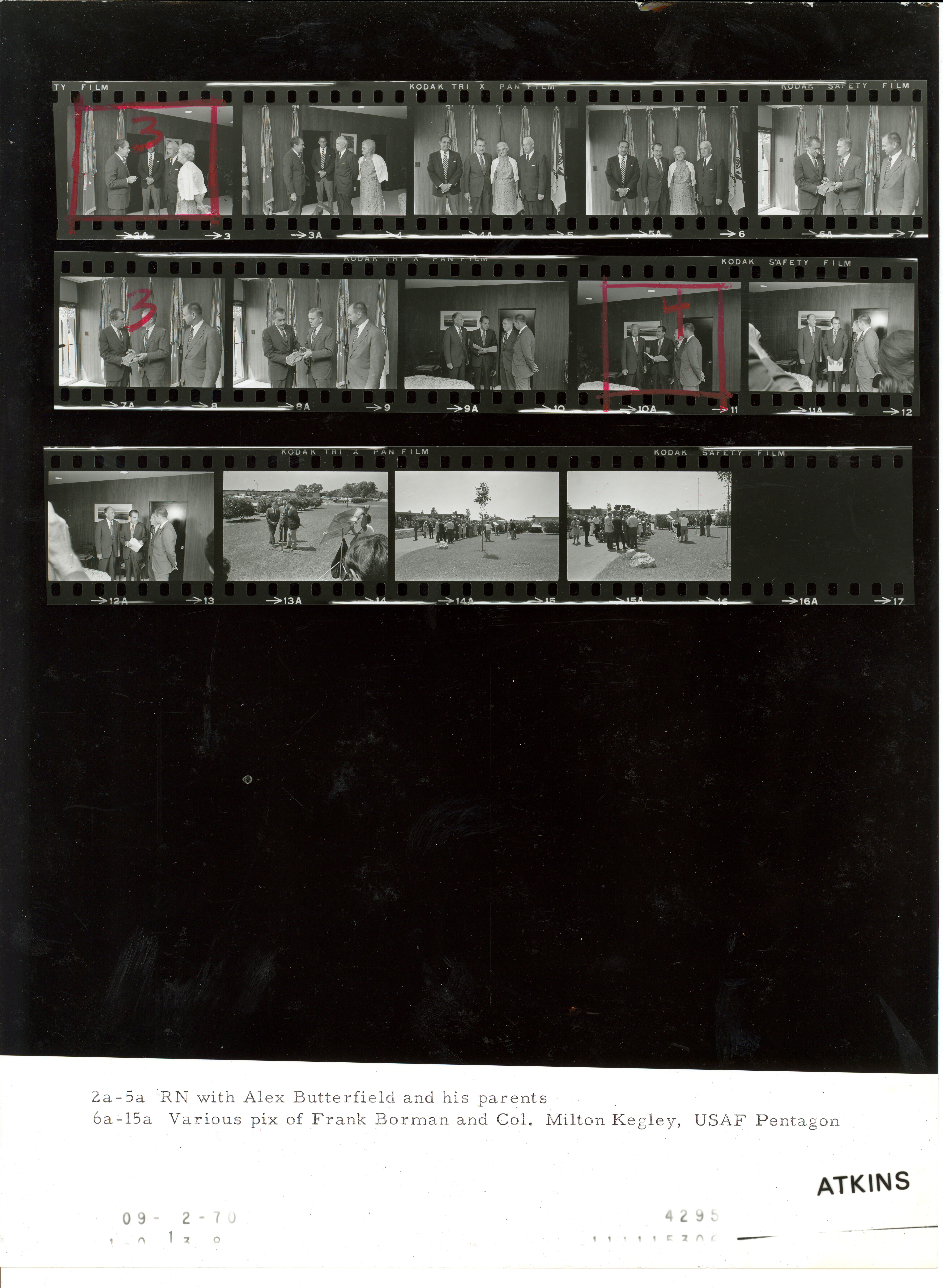 - Frame(s): WHPO-4295-06A-08A, President Nixon and Secretary in his La Casa Pacifica Western White House office meeting with Astronaut Colonel Frank Borman and Col. Milton Kegley, U.S. Air Force Pentagon. 9/2/1970, San Clemente, CA La Casa Pacifica, Western White House, Presidential office. President Nixon, Colonel Frank Borman, Colonel Milton Kegley.