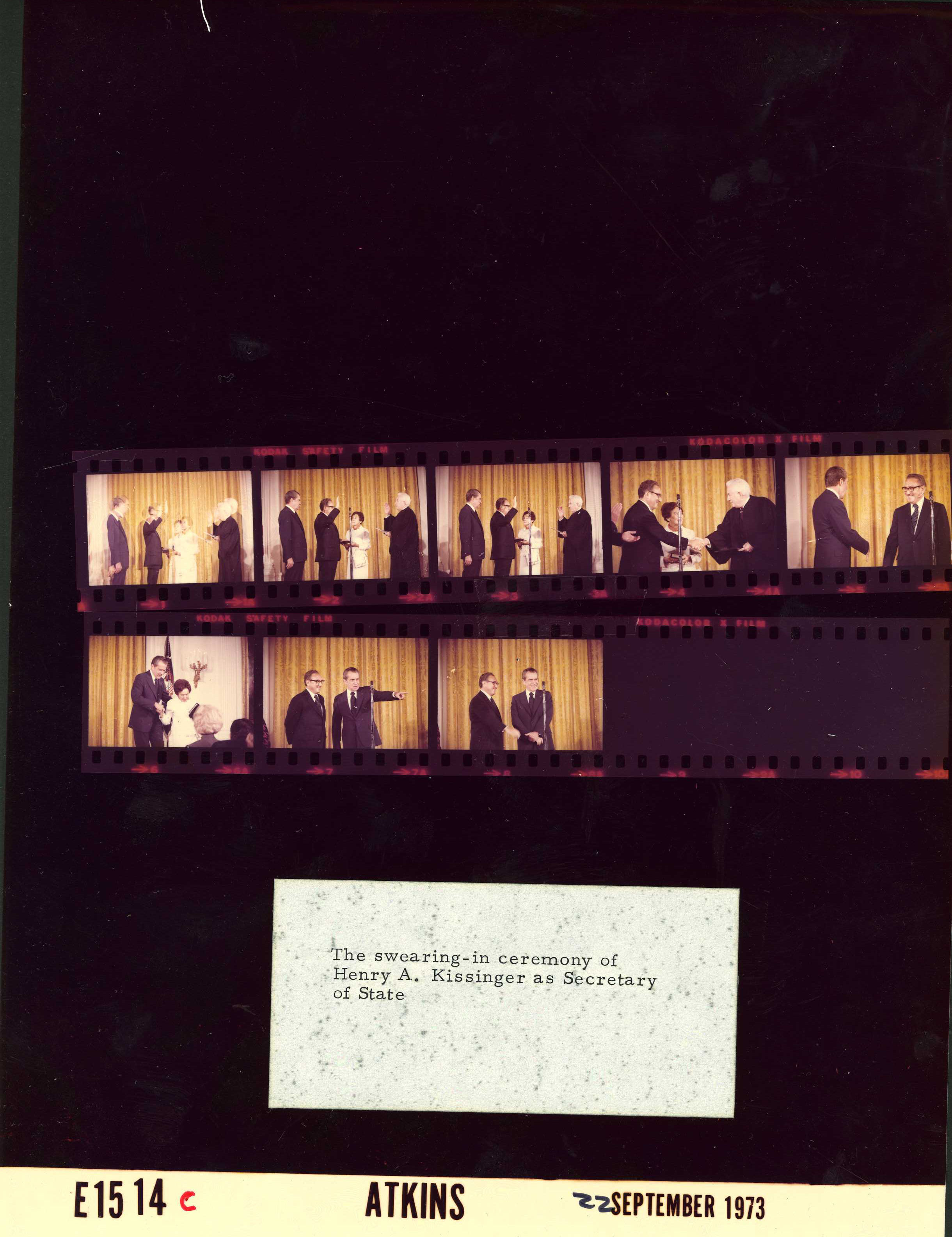 - Frame(s): WHPO-E1515-04, President Nixon standing with Henry Kissinger after his swearing-in ceremony as Secretary of State, by Chief Supreme Court Justice Warren E. Burger. 9/22/1973, Washington DC White House, East Room. President Nixon, Henry Kissinger, guests.
