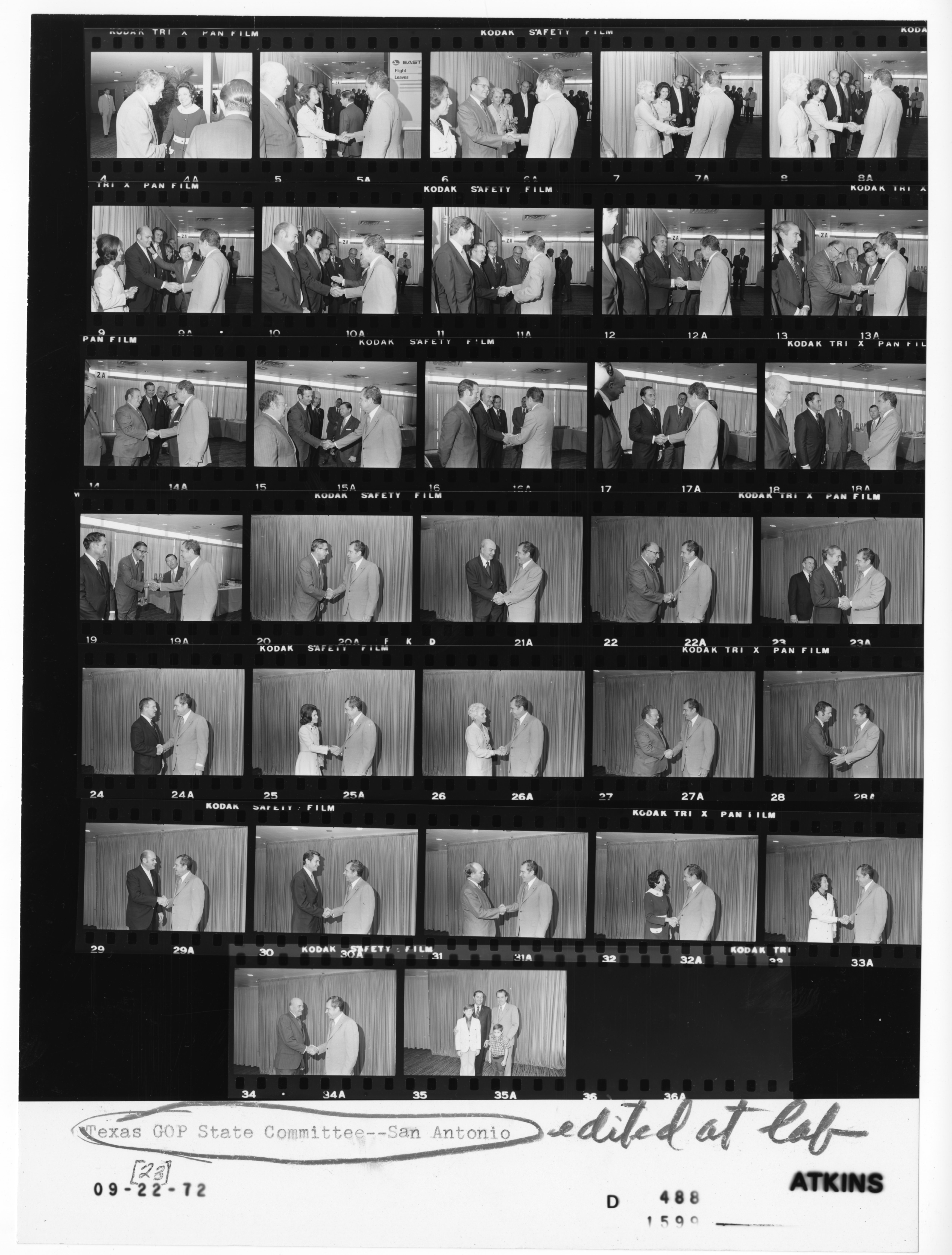 - Frame(s): WHPO-D0488-04A-35A, President Nixon shaking hands with Texas Republican leaders of the GOP state Committee in San Antonio. 9/23/1972, San Antonio, Texas VIP Lounge, airport terminal. President Nixon, Texas Republican leaders, James Baker (State Finance Chairman of the Texas Republican Party and future White House Chief of Staff, Secretary of the Treasury and Secretary of State) in frames 14, 15, 16 and 28.