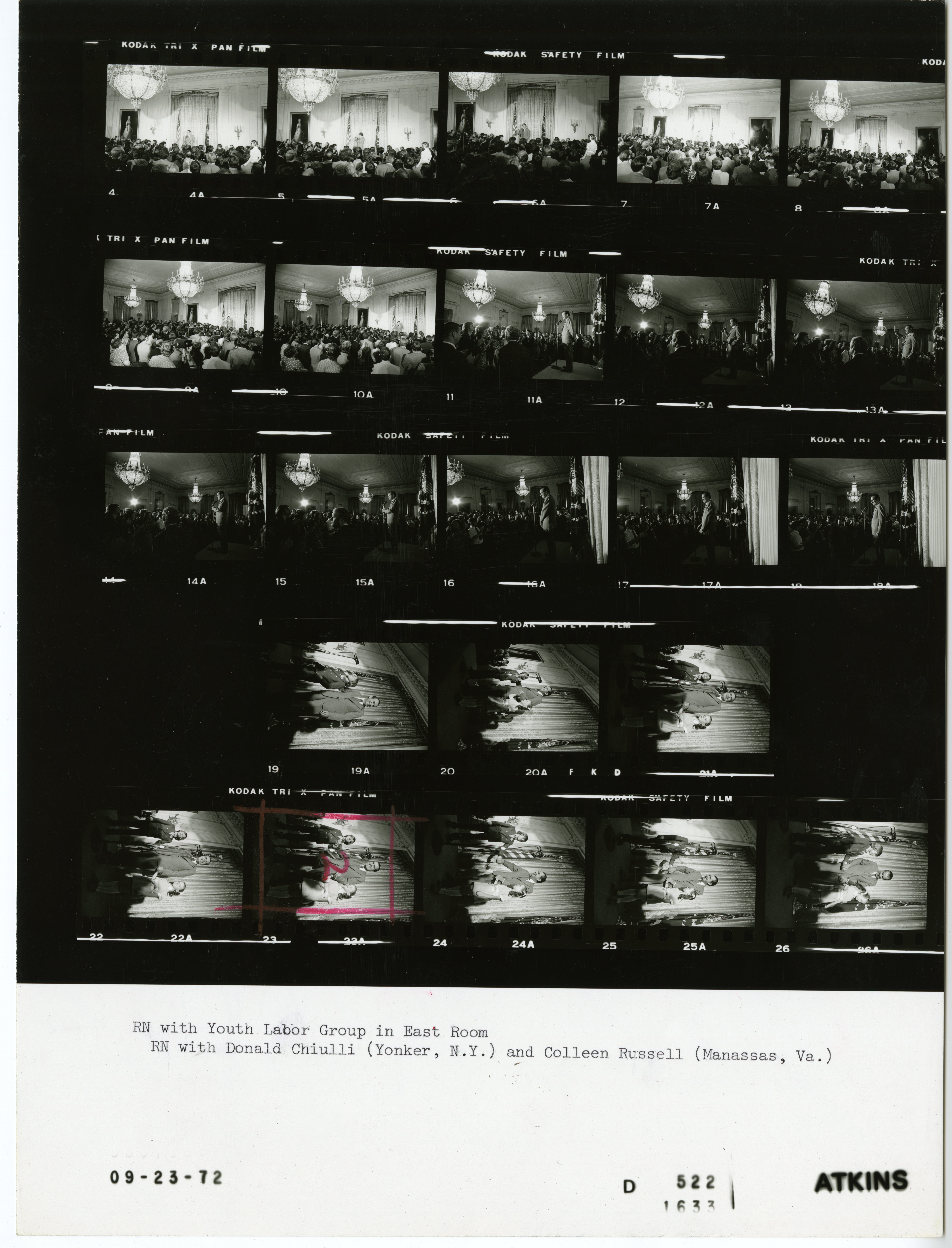 - Frame(s): WHPO-D0522-, President Nixon speaking to and standing with members of "Young Labor for the President.". 9/23/1972, Washington, D.C. White House, East Room. President Nixon, Donald Chiulli, Colleen Russell, group officers and members.