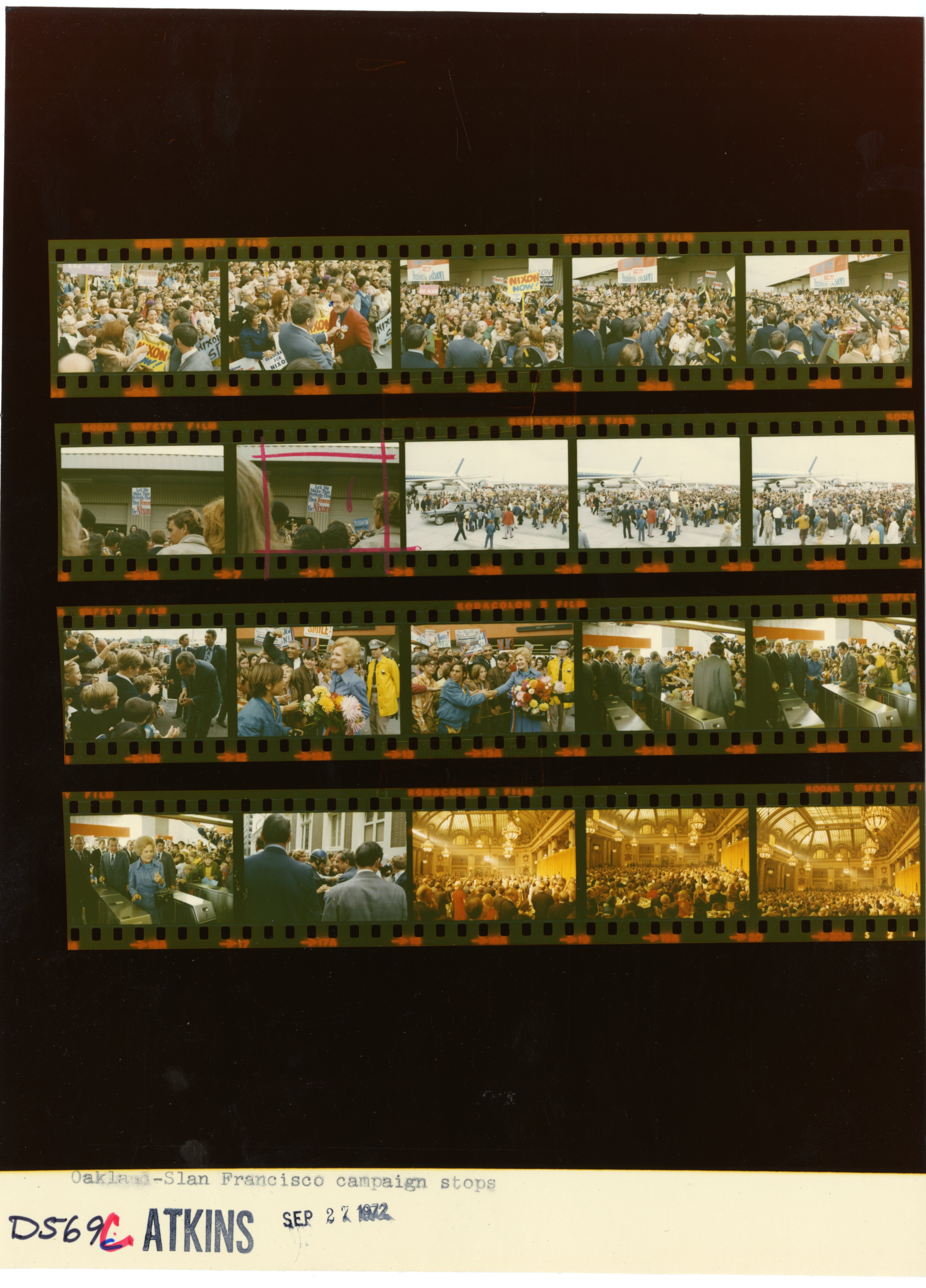 - Frame(s): WHPO-D0553-10-18, Pat Nixon greeting a crowd of supporters during a campaign fund raising stop. 9/27/1972, Oakland, Lake Merritt, San Francisco, California tarmac, Oakland International Airport; BART station; Garden Court Ballroom, Sheraton Palace Hotel. President Nixon, Pat Nixon, crowd, William Stokes, BART officials and employees, guests.