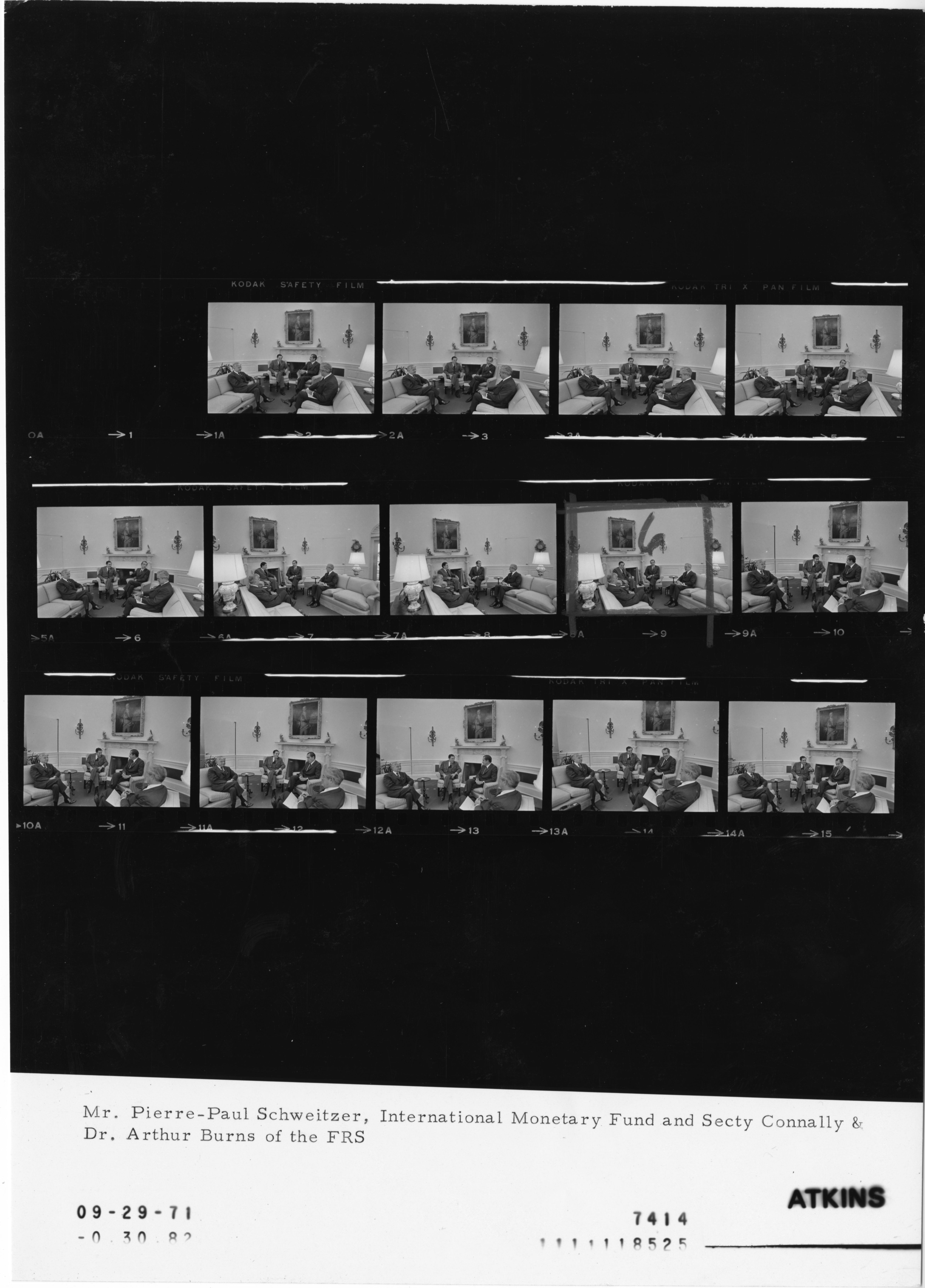 - Frame(s): WHPO-7414-01A-14A, President Nixon sitting with International Monetary Fund (IMF) Managing Director Pierre-Paul Schweitzer, Secretary Connally, and Dr. Arthur Burns of the FRS. 9/29/1971, Washington, D.C. White House, Oval Office. President Nixon, Pierre-Paul Schweitzer, John B. Connally, Arthur F. Burns.