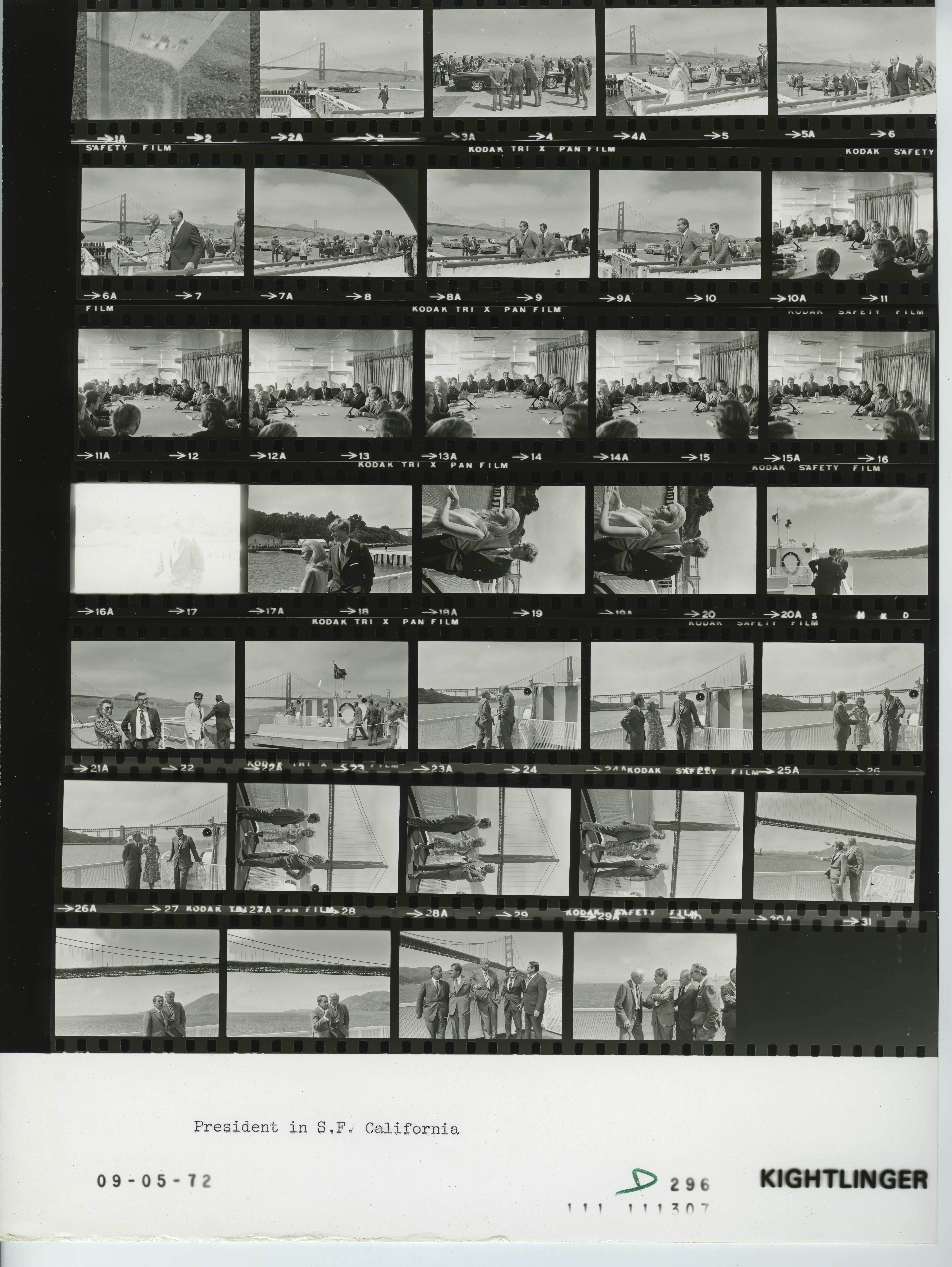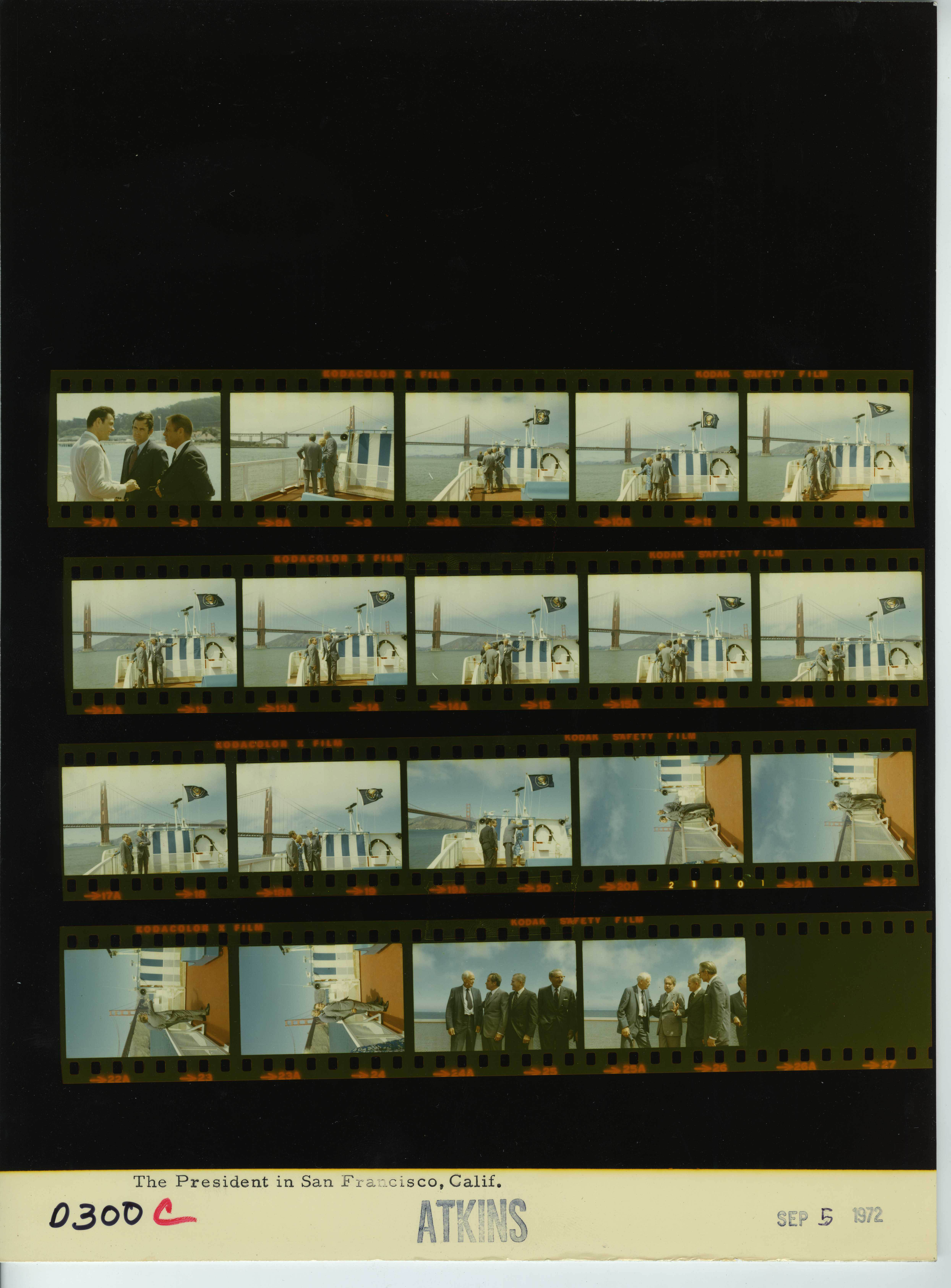 - Frame(s): WHPO-D0300-08A-25A, President Nixon standing on the deck of a San Francisco ferry boat with other unidentified people. Golden Gate Bridge is visible in the background. 9/5/1972, San Francisco Bay, California deck, ferry boat. President Nixon, Pat Nixon, Rogers Morton, Charles Lindbergh, Frank Borman, Laurence Rockefeller, Ziegler, Haldeman, unidentified man.