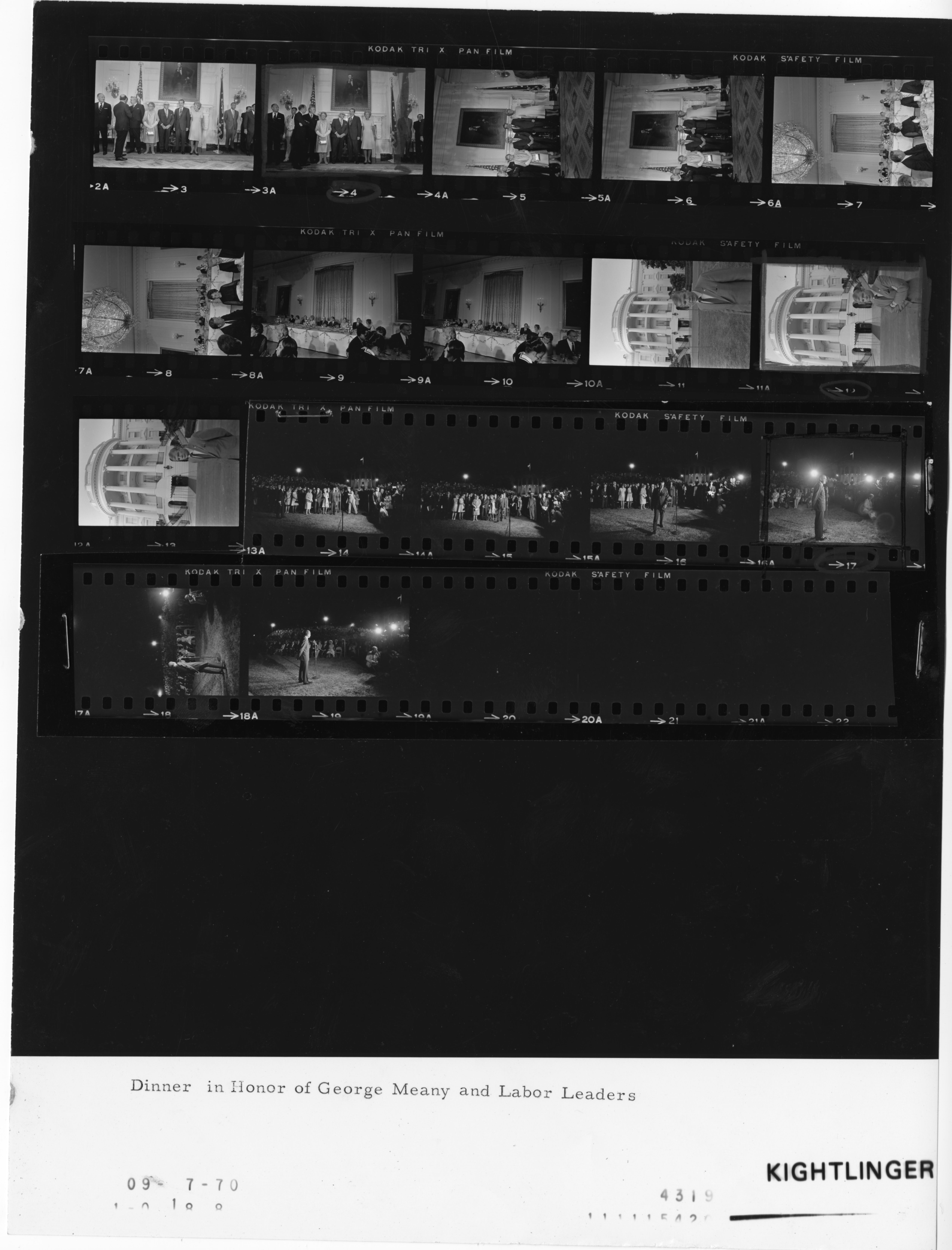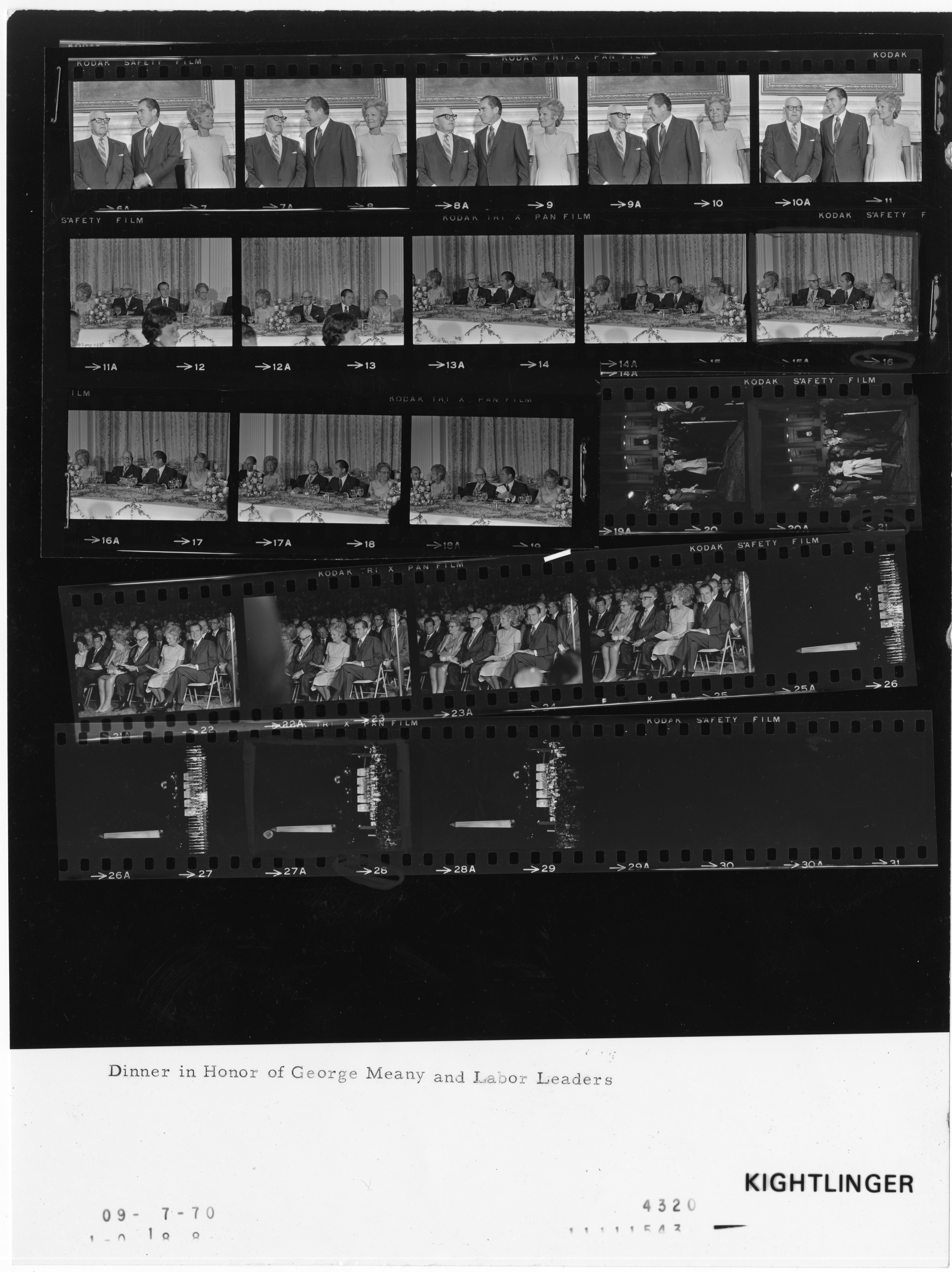 - Frame(s): WHPO-4319-, President Nixon hosts a dinner for US labor leaders, including AFL-CIO President George Meany. 9/7/1970, Washington, D.C. White House, East Room. President Nixon, Pat Nixon, William Rogers, George L. Meany, Mrs. Meany, William J. Usery, unidentified labor leaders.