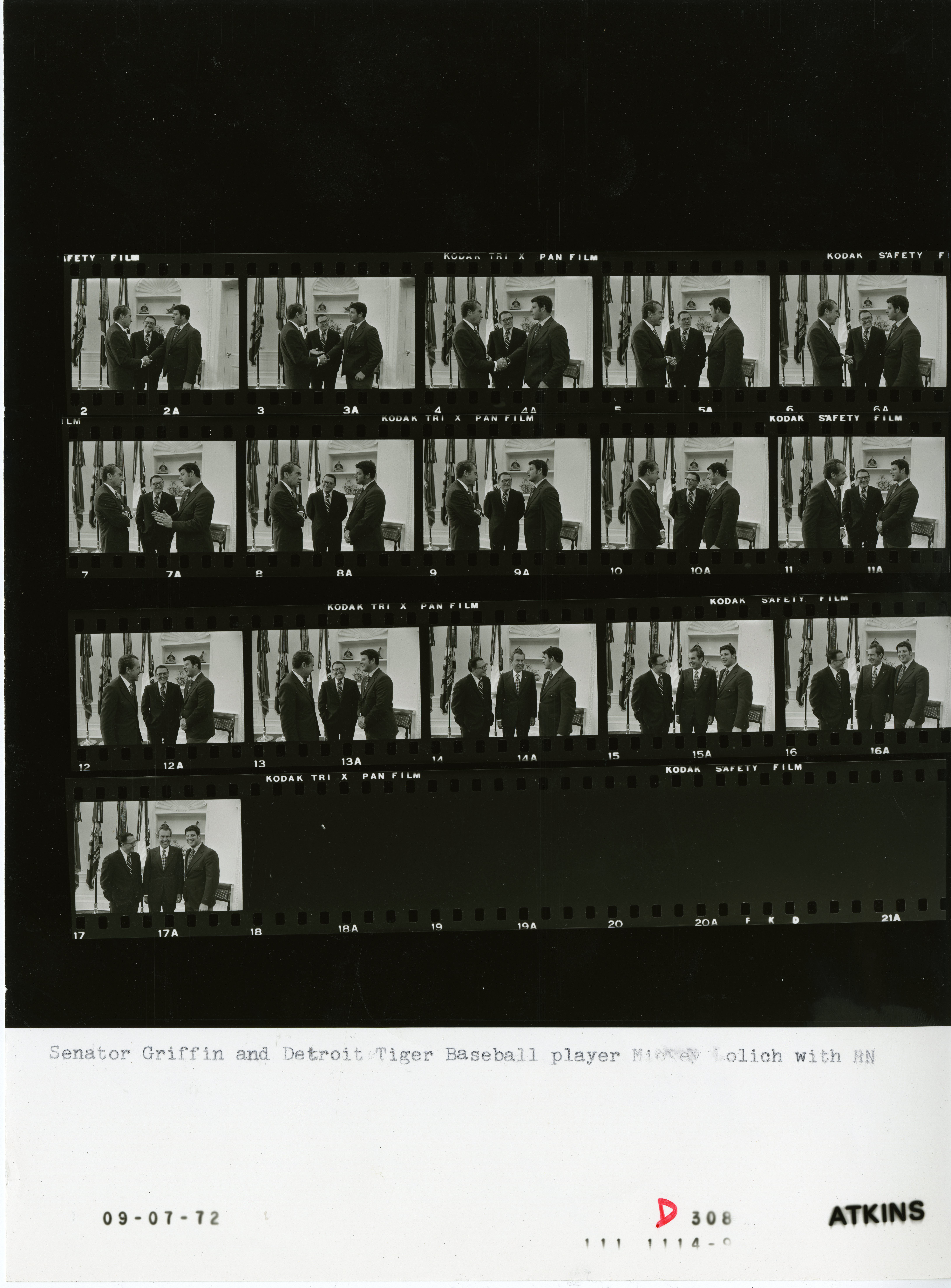 - Frame(s): WHPO-D0308-, President Nixon standing with Sen. Griffin and Detroit Tigers pitcher Mickey Lolich. (baseball). 9/7/1972, Washington, D.C. White House, Oval Office. President Nixon, Robert Griffin, Mickey Lolich (baseball).